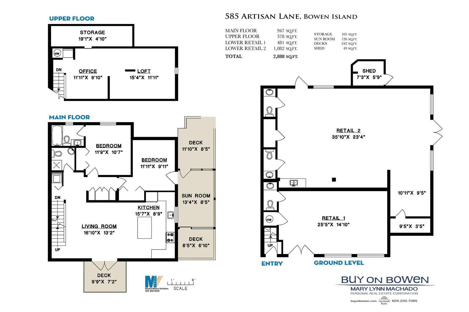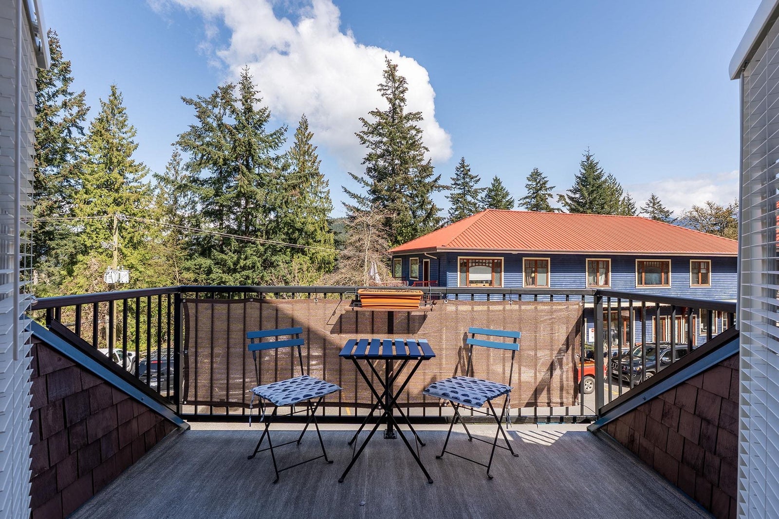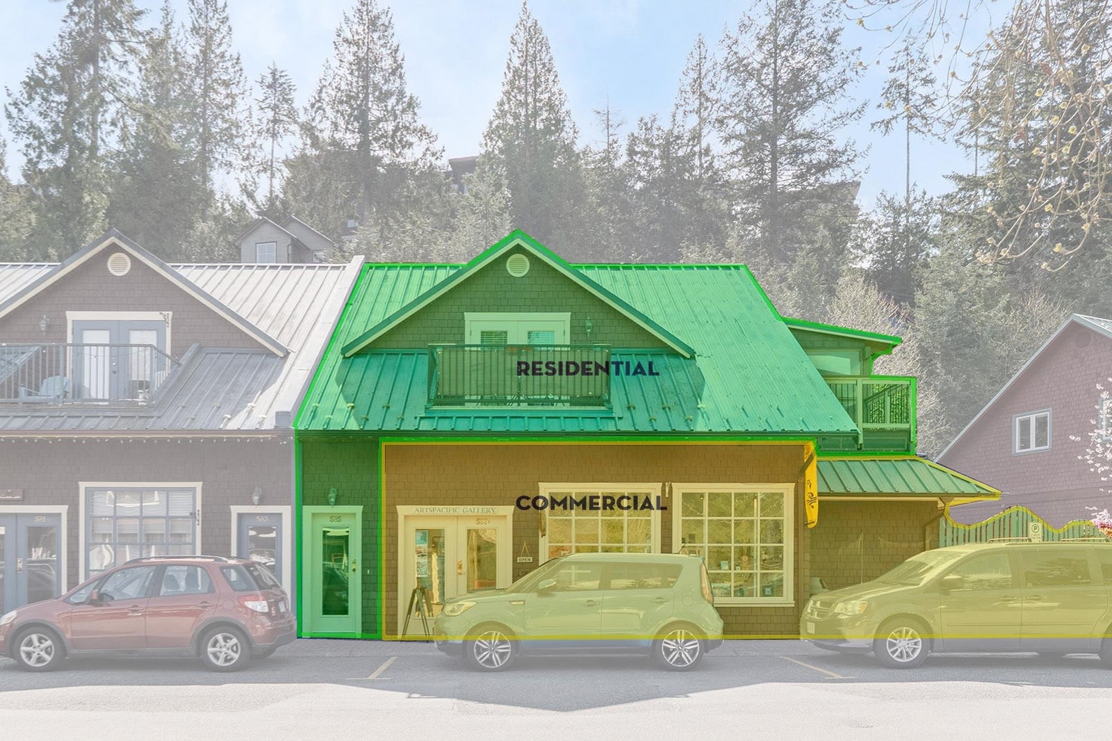 Artisan Square is a picturesque Bowen Island community of shops, galleries, wellness services, and small businesses. Several colourful low rise buildings combine commercial spaces with apartment-style homes. 585 Artisan Lane features a renovated 2 BED, 2 BATH TWO-LEVEL APARTMENT, including a loft with skylights. There’s a small deck overlooking the square and a larger private deck on the west side with an enclosed sunroom. On the ground floor are 2 COMMERCIAL SPACES each with 1/2 baths – Arts Pacific Gallery and Growing Space Montessori School. Updates to the apartment include new flooring, new kitchen, new bathrooms, new appliances, new gutters, and more. Flexible zoning regulations provide a variety of uses. This is a rare opportunity to own a building in Artisan Square.