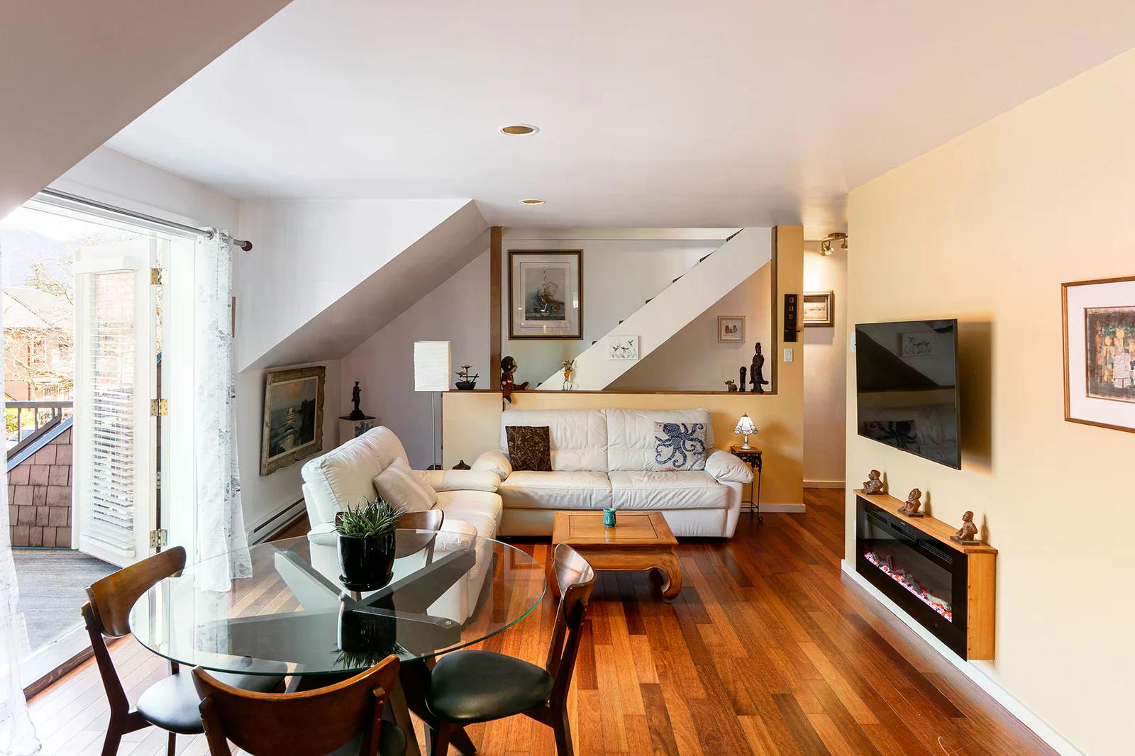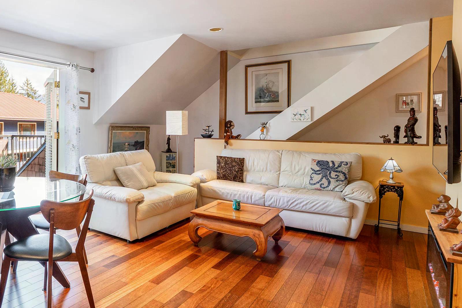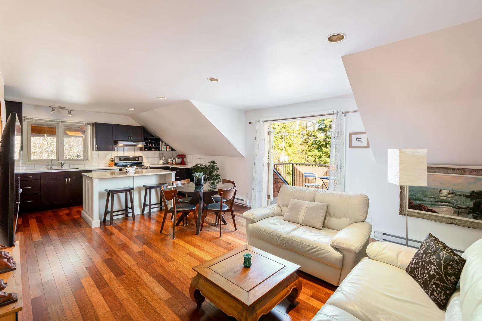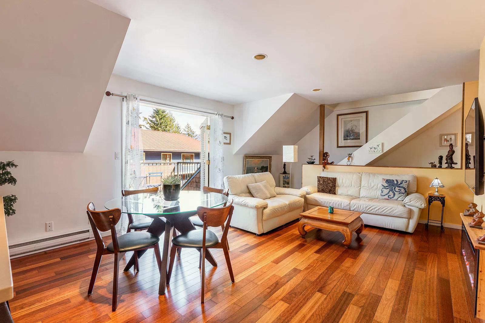 585 Artisan Lane features a modern, renovated 2 bedroom, 2 bathroom, 2 level apartment including a loft with skylights. There’s a small deck overlooking the square and a larger private deck on the west side with an enclosed sunroom.