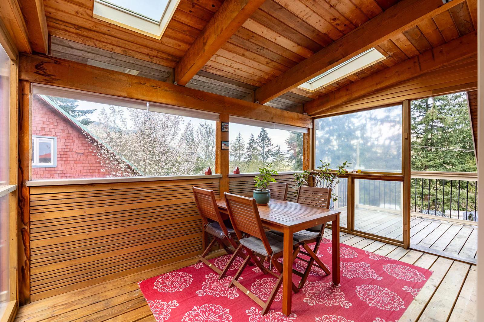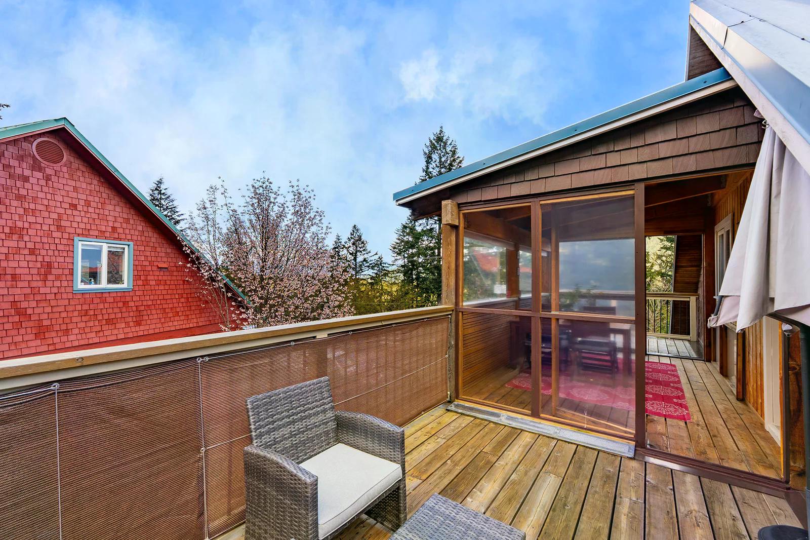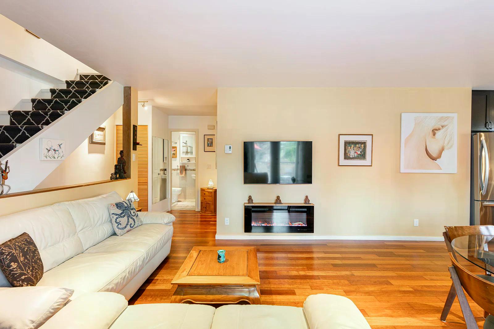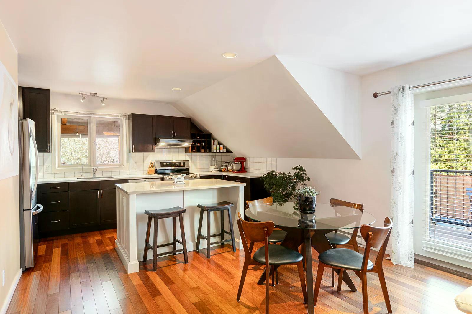 585 Artisan Lane features a modern, renovated 2 bedroom, 2 bathroom, 2 level apartment including a loft with skylights. There’s a small deck overlooking the square and a larger private deck on the west side with an enclosed sunroom.
