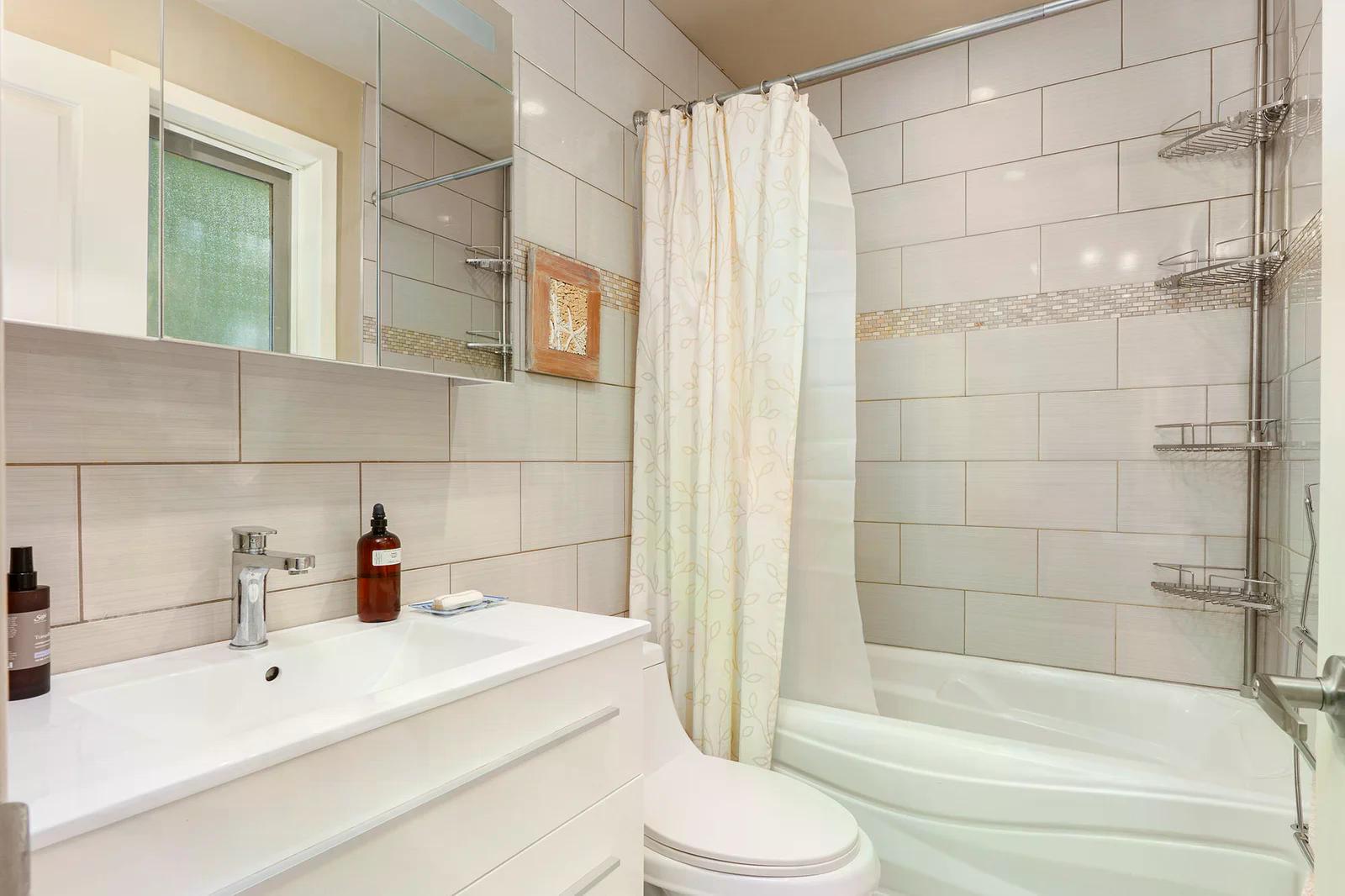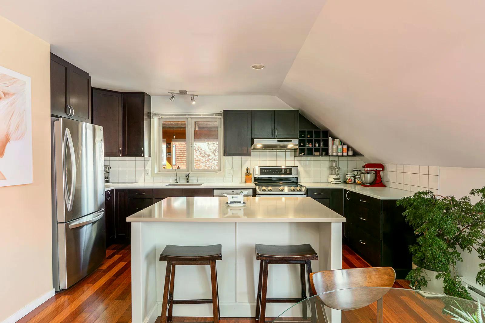 On the ground floor are 2 commercial spaces with well-established tenants – Arts Pacific Gallery (481 sq.ft.), and Growing Space Montessori School (1082 sq.ft.). Updates to the apartment include new flooring, new kitchen, new bathrooms, new appliances, new gutters, and more.