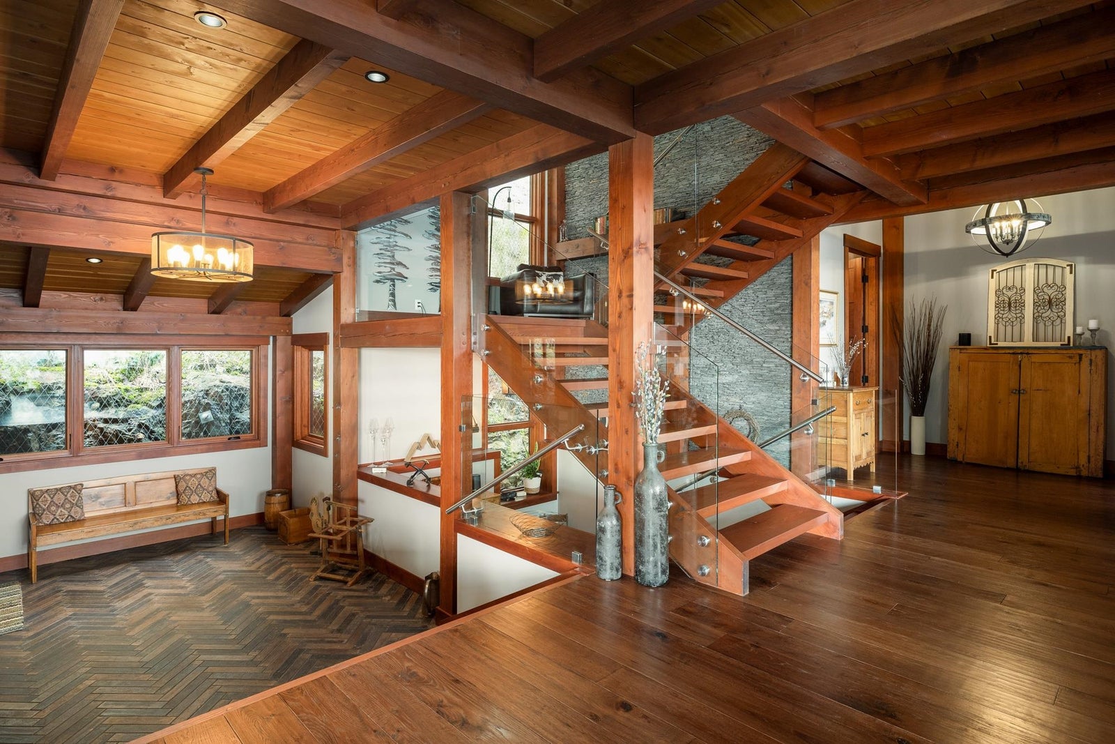 This stunning ocean view property featuring a masterpiece of engineering, custom built, Canadian Timberframe Ltd home is ready to welcome a new family. The expansive timber peaks & over 1100 sq.ft. covered entertainment deck sets it apart. The open plan main floor boasts timberframe ceilings soaring over 24'. Custom Loewen Douglas Fir interior/metal exterior windows & doors, engineered Hickory flooring & exclusive lighting compliment the space. Chefs will covet the gourmet kitchen with state of the art appliances & expansive Quartz countertops. Main level primary bedroom, ensuite & walk in closet showcase the cathedral timberframe ceilings. A special retreat w/floor to ceiling fireplaces & private decks overlooking ocean, mountain and coastal views. Vancouver within easy reach.