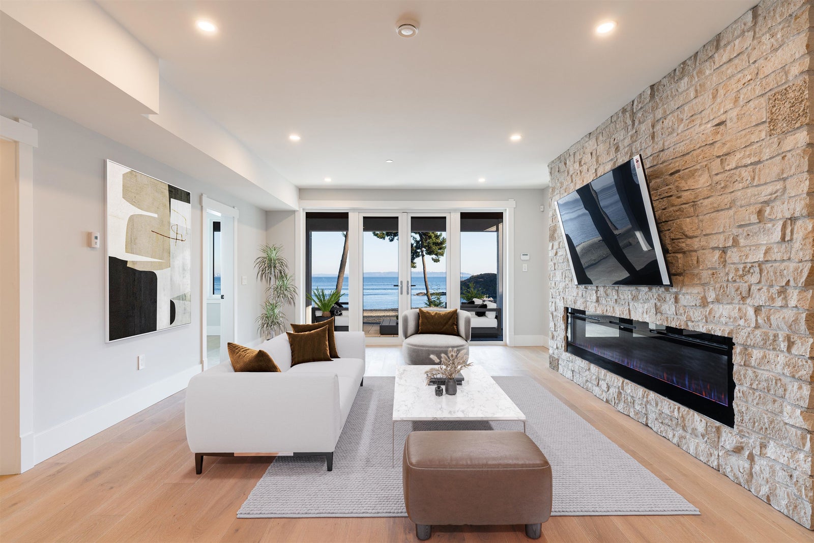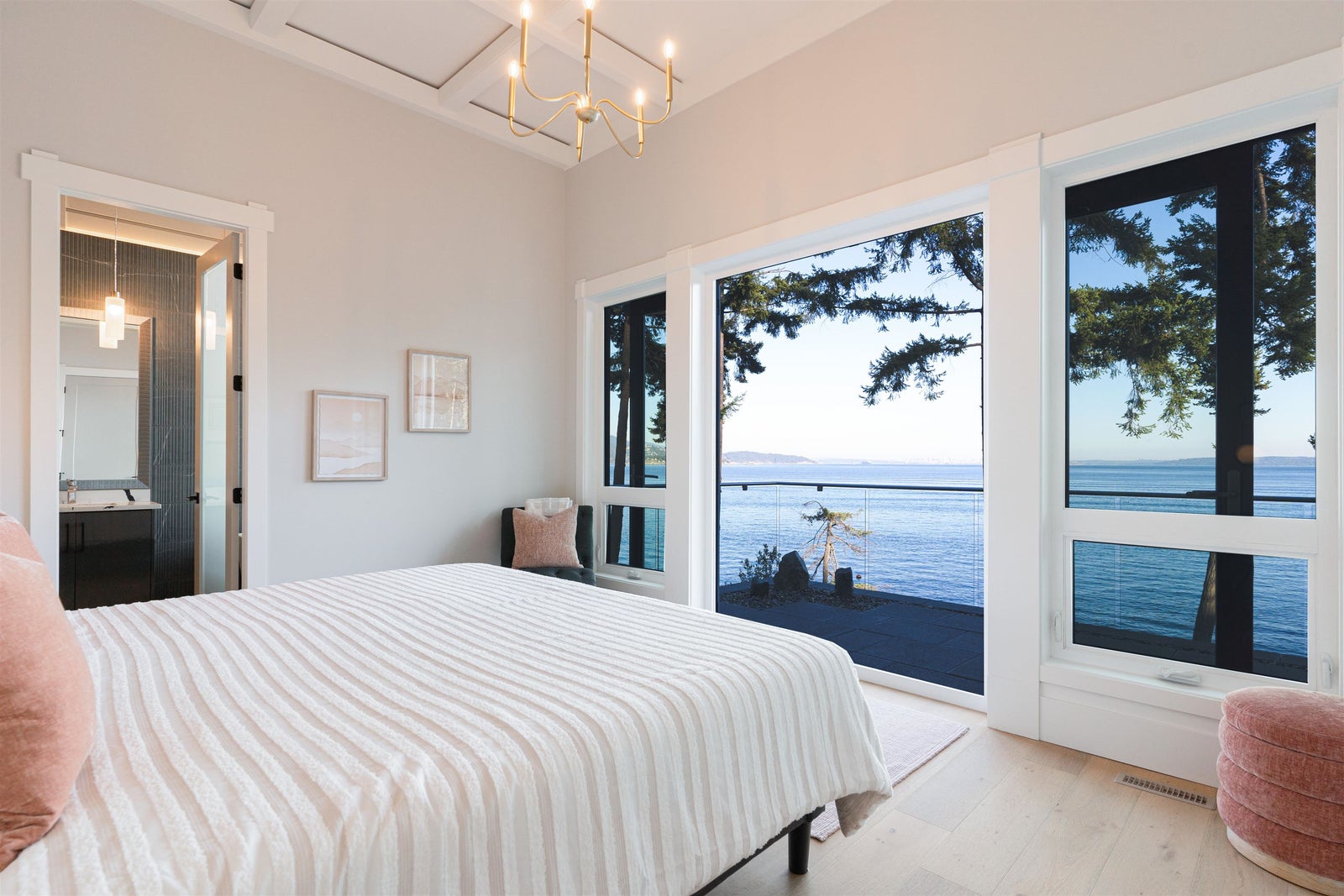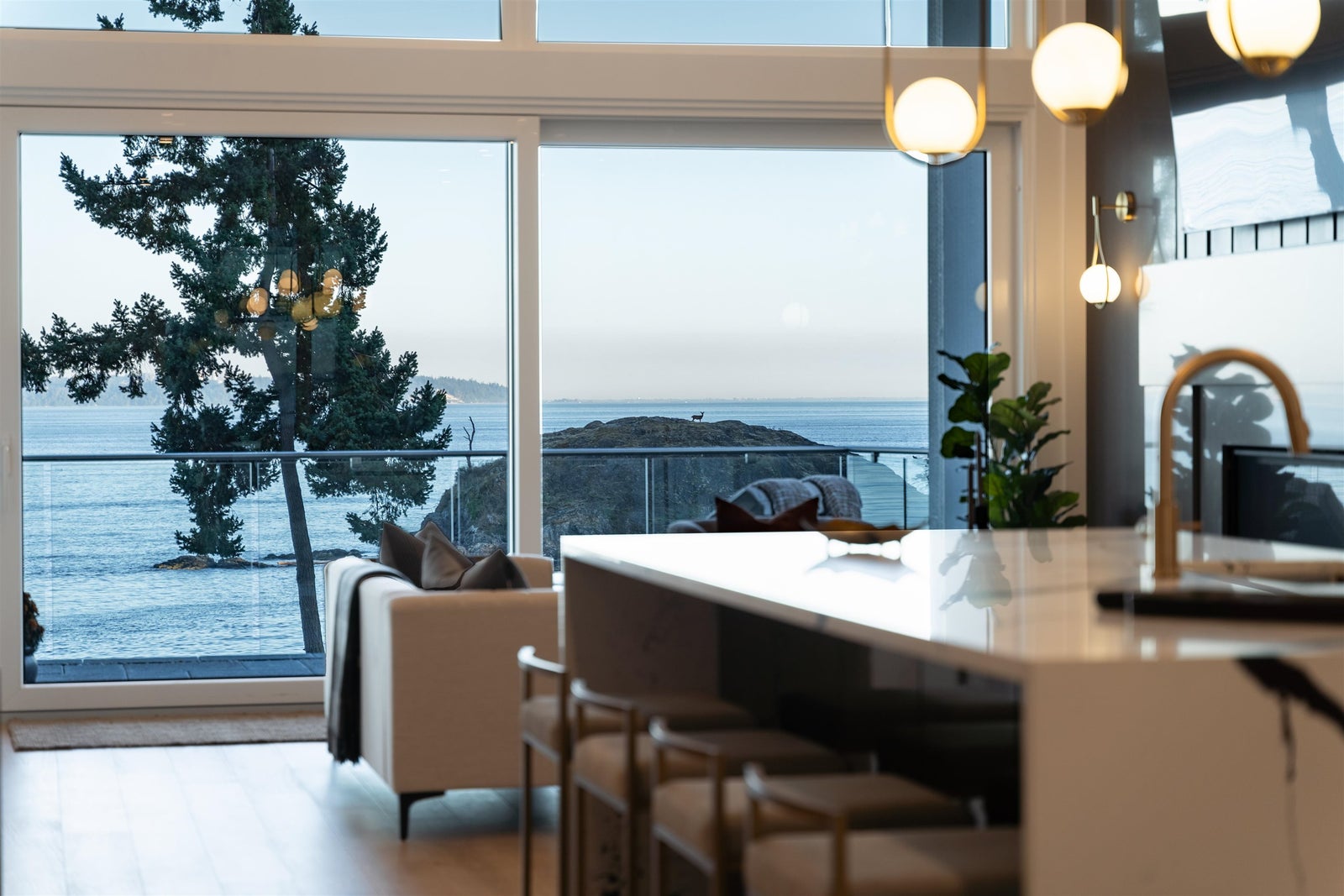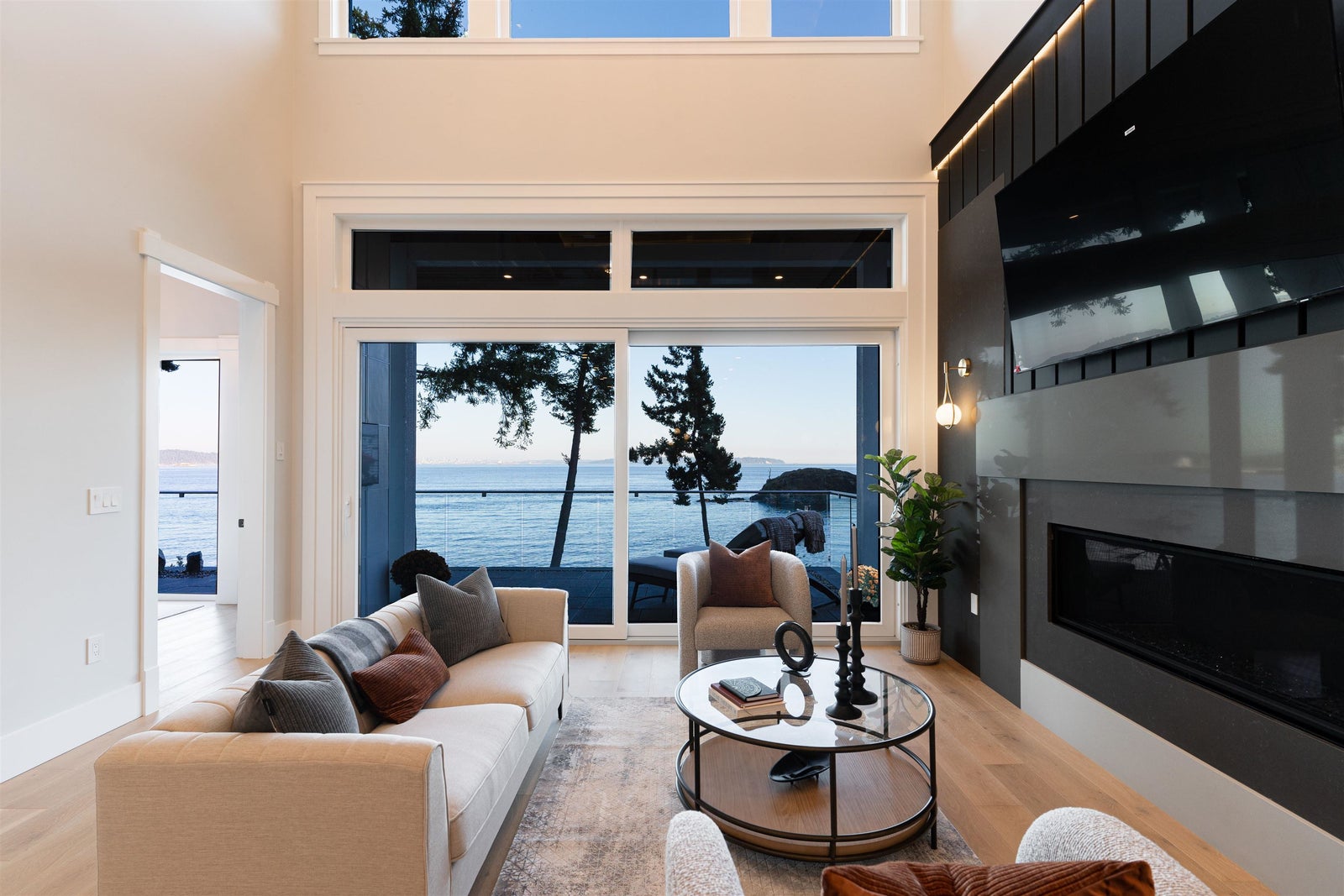 Discover the pinnacle of coastal living at Seymour Landing, where sunshine abounds and the Vancouver skyline blends with the shimmering sea. Be captivated by seasonal sightings of humpback whales and orcas gliding along the coast. This residence is set just 125 feet from the shoreline—a rare find on Bowen, where many waterfront homes are perched high and set back. From the double-height front entry, enjoy unobstructed views through the open-concept living, dining, and kitchen area straight to the ocean. Boasting upscale, distinctive finishes and a main-level primary suite with a steam shower, this newly built 3,600 sq ft home appeals to buyers with a taste for elegance. A quick trail walk brings you to the nearby golf course within minutes.