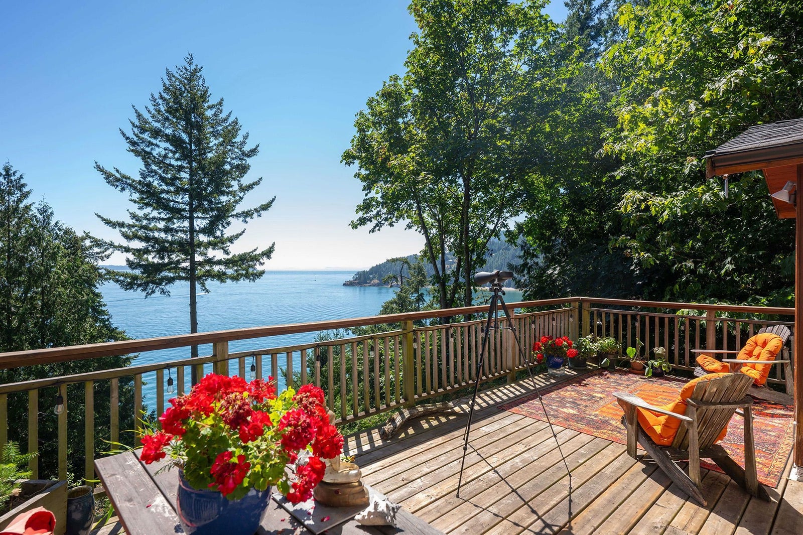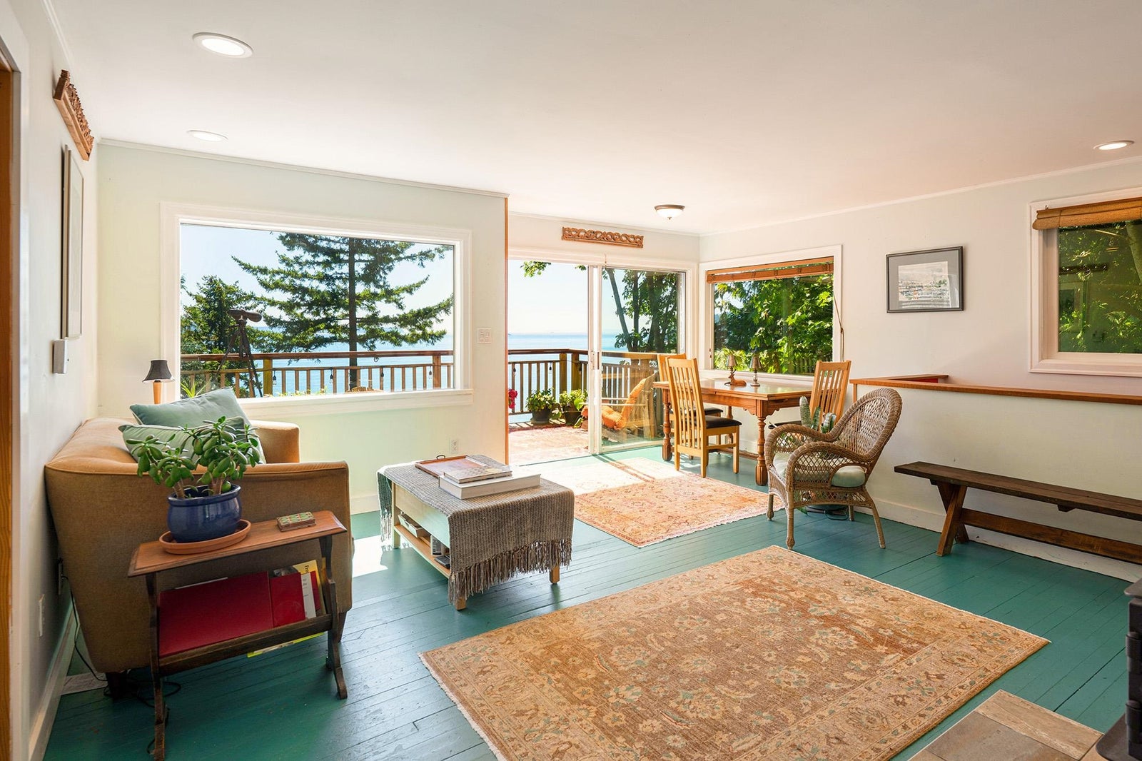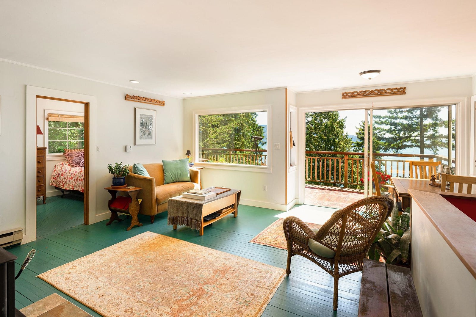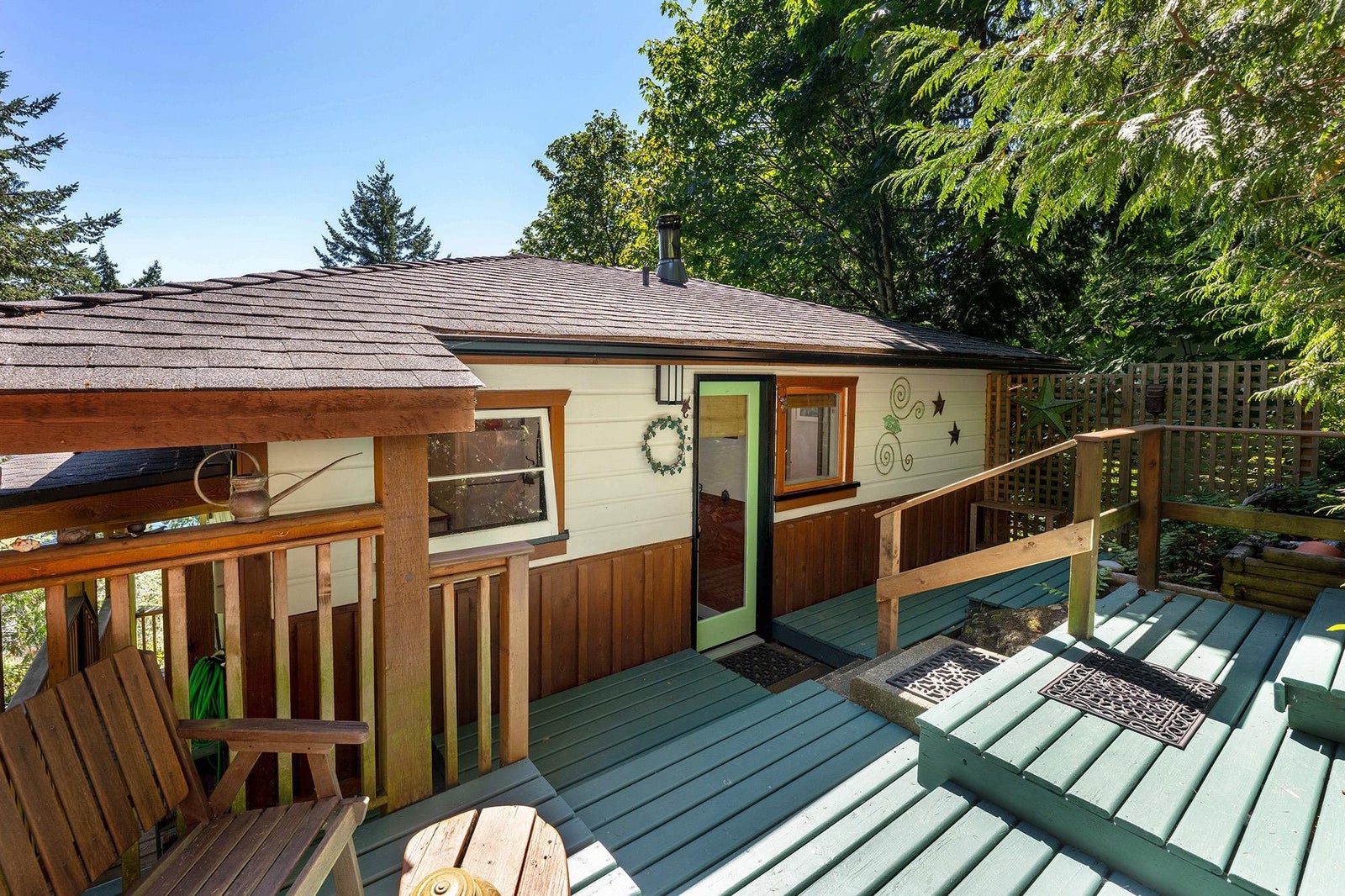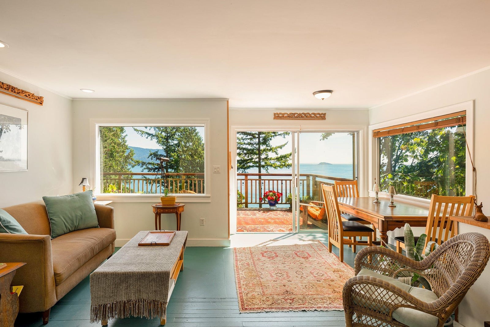 This charming & cozy vintage Bowen cottage is a perfect island getaway. From the front door you are welcomed with a beautiful view of the ocean looking out to Bowen’s shoreline and the Gulf Islands in the distance. The spacious south-facing deck is where you’ll spend time lounging with a book or gazing at the beauty of a full moon reflecting on the water. Inspired by the ocean there is a delightful deep turquoise front deck and painted wood floors on the main level. Downstairs is cheery with the terracotta painted floors and large windows with ocean views. Updates include a newer septic system, roof, gutters, and more. The community dock at Eagle Cliff beach (a 5 min. walk) is a popular place for locals to hang out and swim, and you can also tie up your dinghy during the summer season.