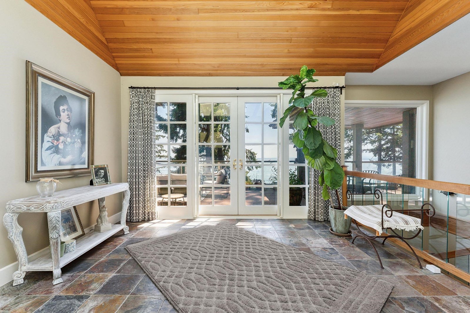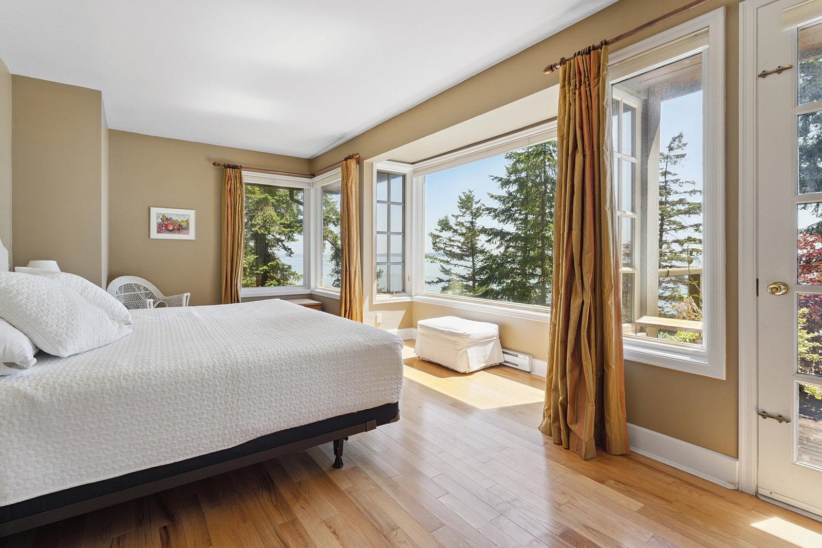 Fairweather Point – an enclave of architectural WATERFRONT homes sits on the South Shore of Bowen with views from Vancouver to the Gulf Islands. The coast here is alive with wildlife year round including seasonal visits from Humpbacks & Orcas. With a gently sloping backyard and a path of stone steps down to the water, you can go swimming any time. The spectacular views start at the front door and are showcased in almost every room. A dramatic 15’ barrel ceiling in the living room is the focal point of the open plan living/dining/kitchen. All rooms on the main floor have access to a 600+ sf south-facing deck, including the primary suite. Downstairs is a huge family room with French doors to the backyard, plus 3 more bedrooms. Excellent value for low bank WATERFRONT on Bowen Island.